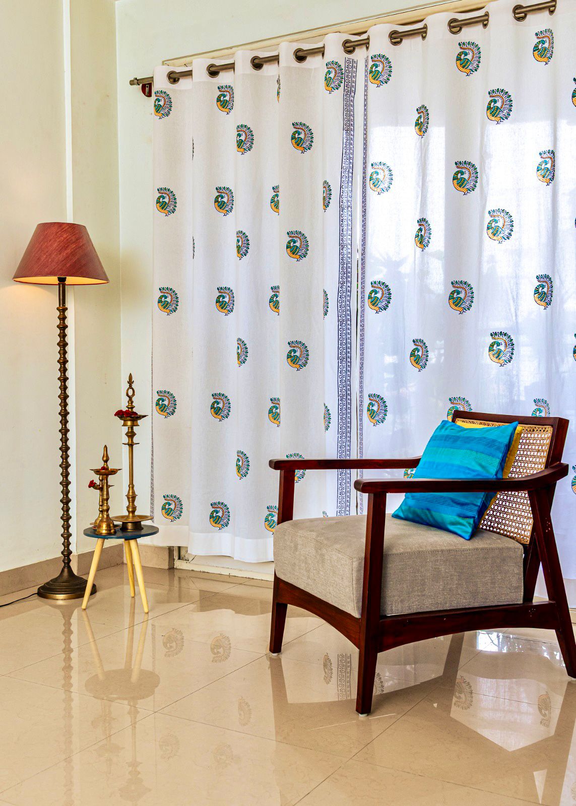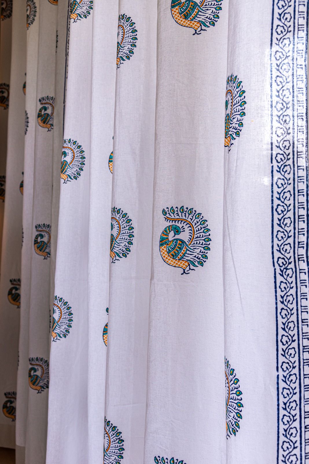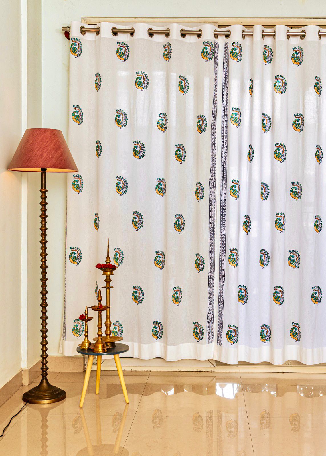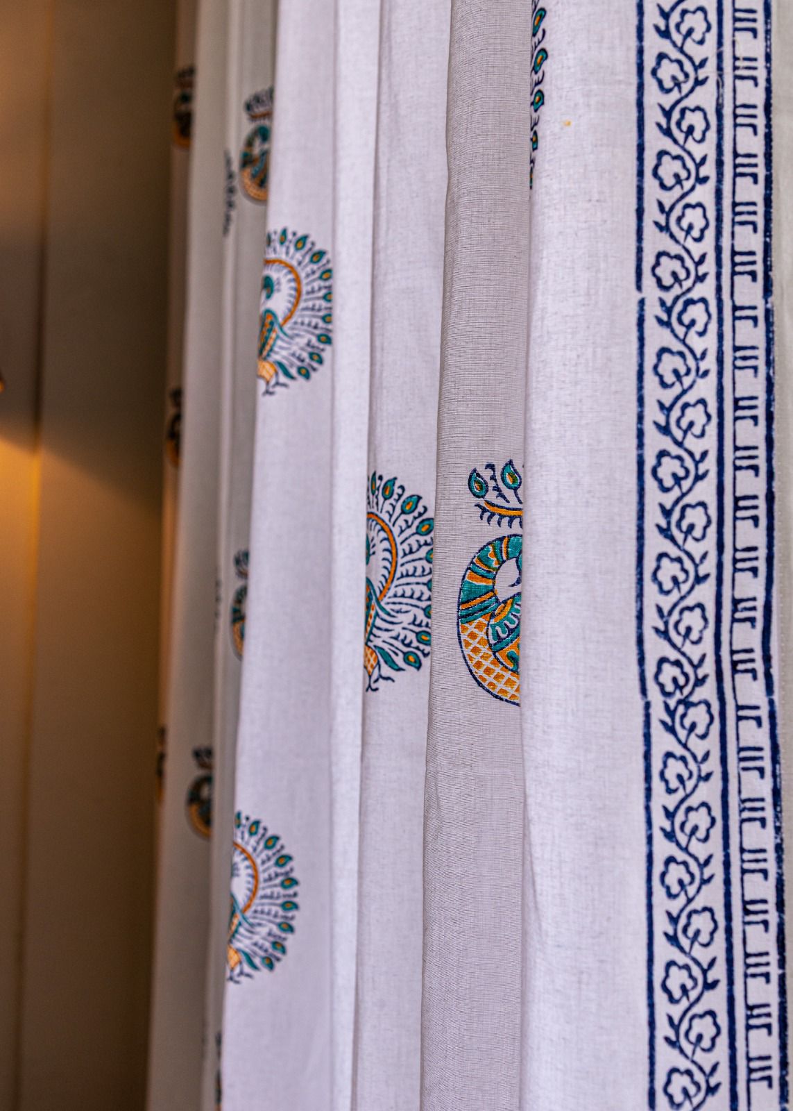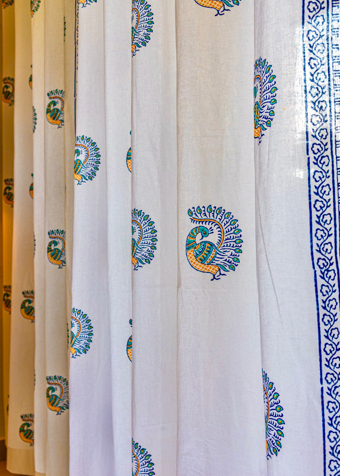 The famous flashy feather trains and vibrant indigo, turquoise green & yellow plumage makes the peacock print look so very ethnic and classic