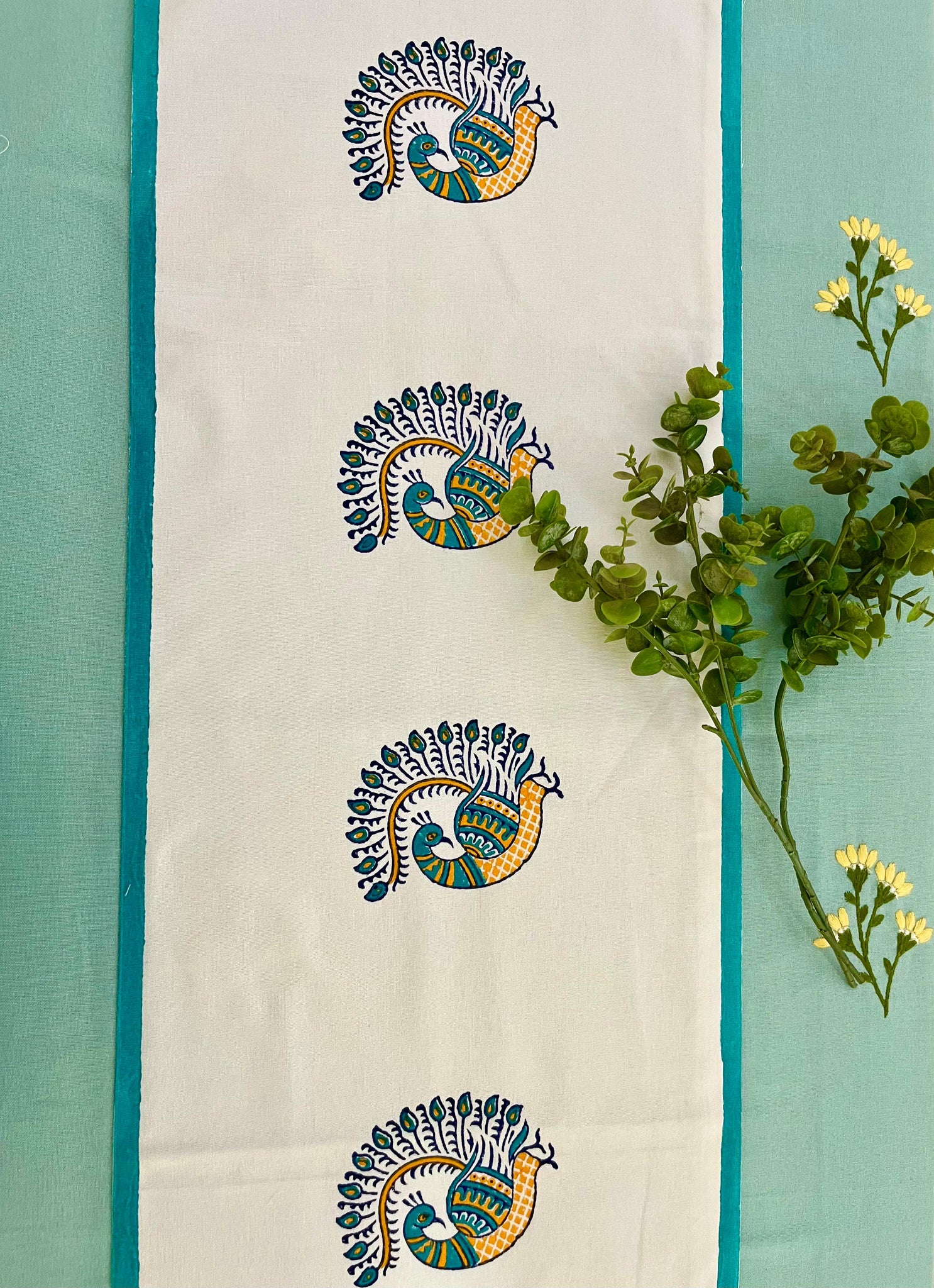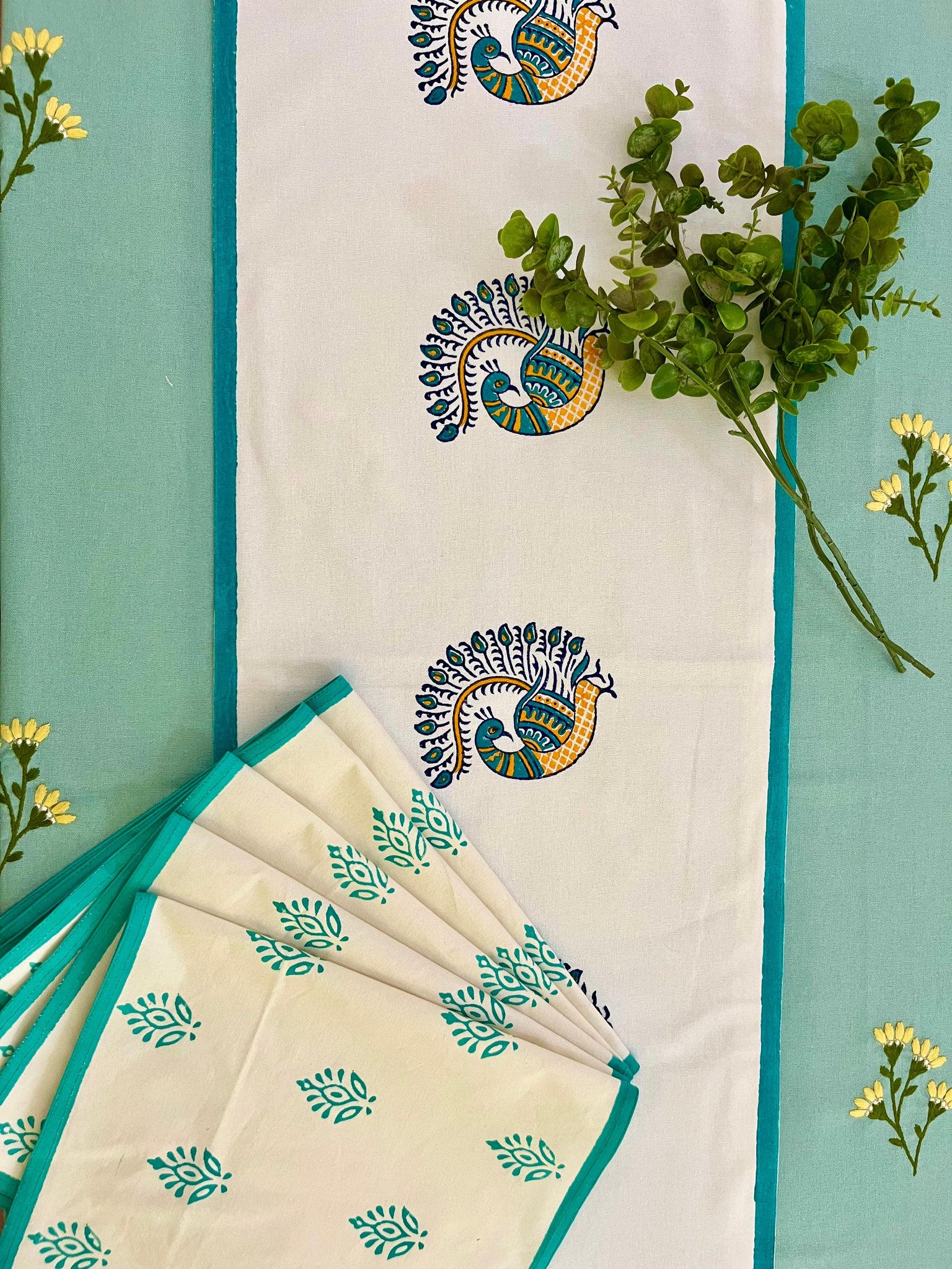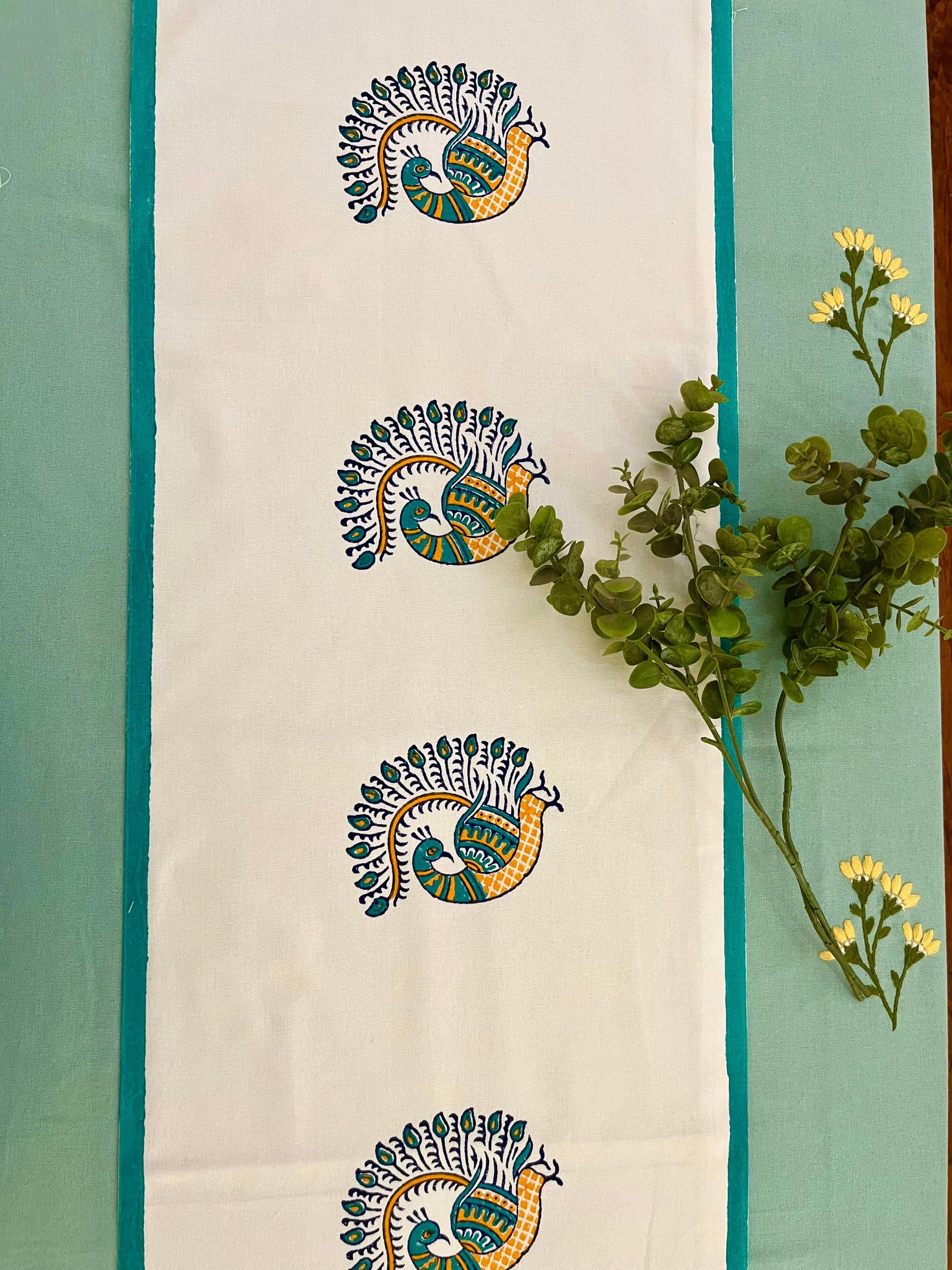 Hand Block Print Peacock Table Runner with 6 Table Mats -