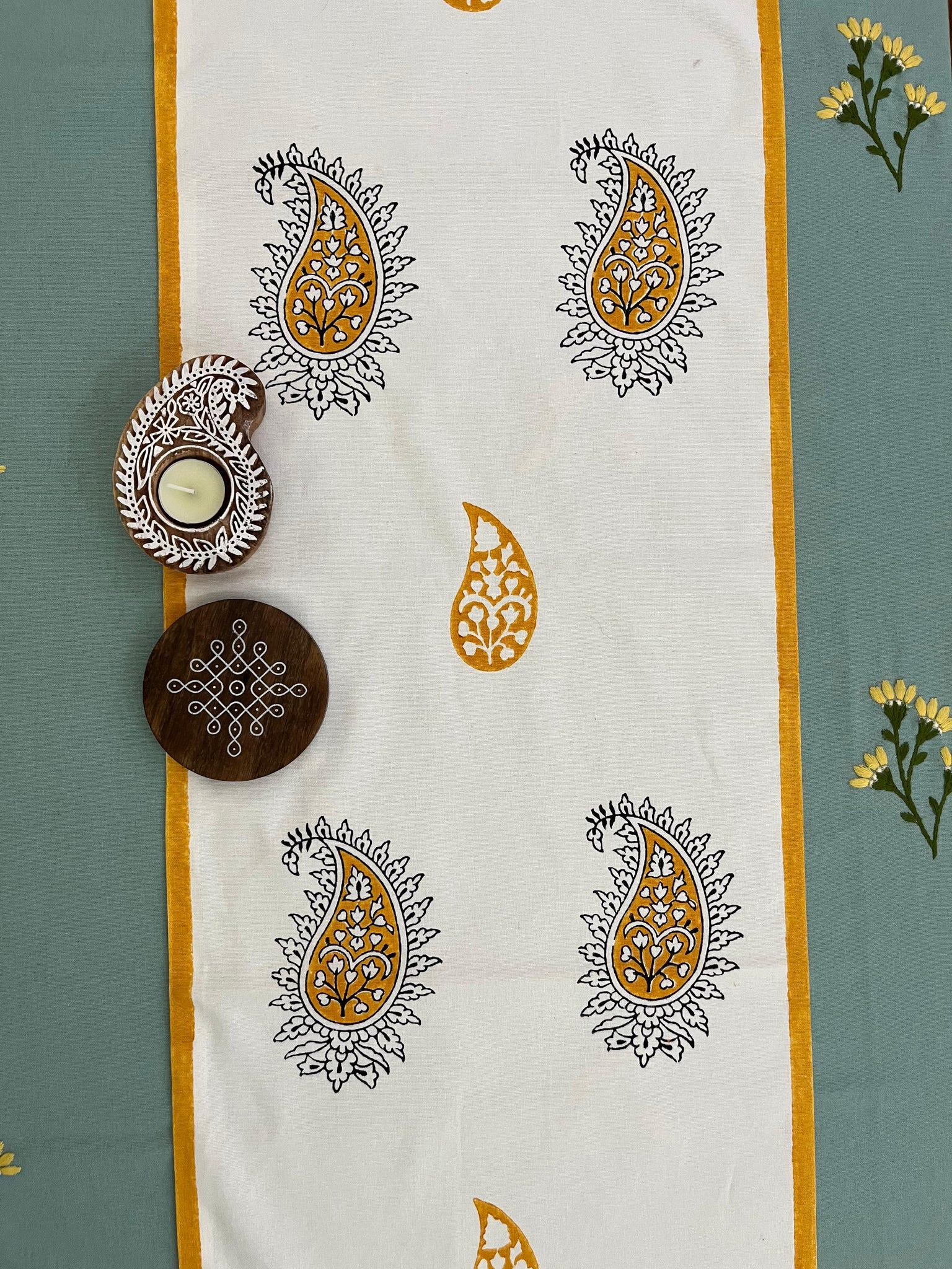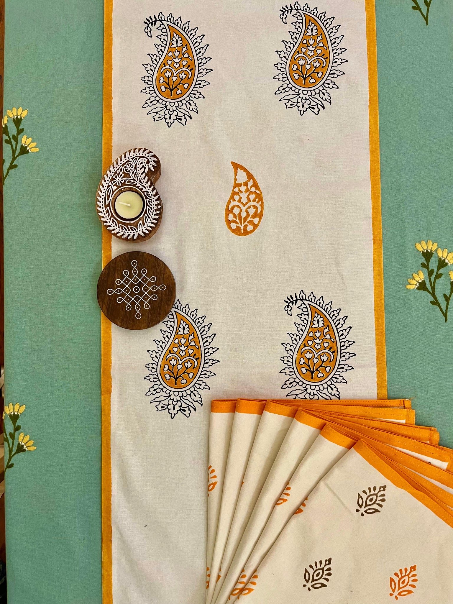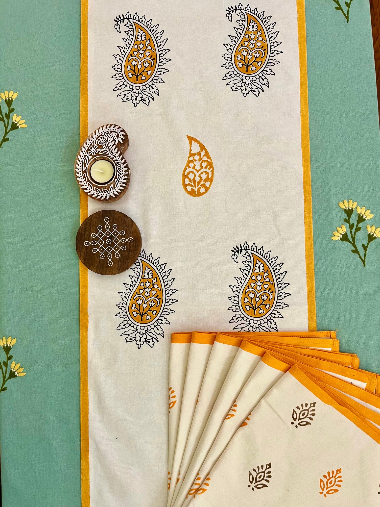 Hand Block Print Paisley Table Runner with 6 Table Mats -