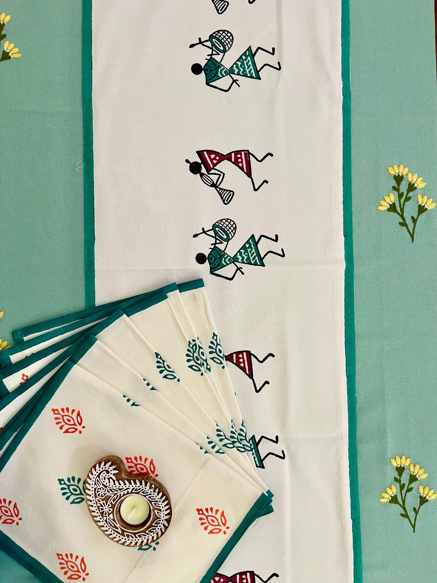 Hand Block Print Warli Table Runner with 6 Table Mats -