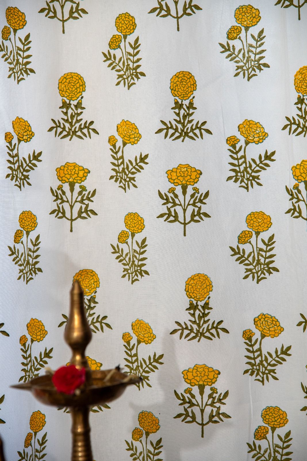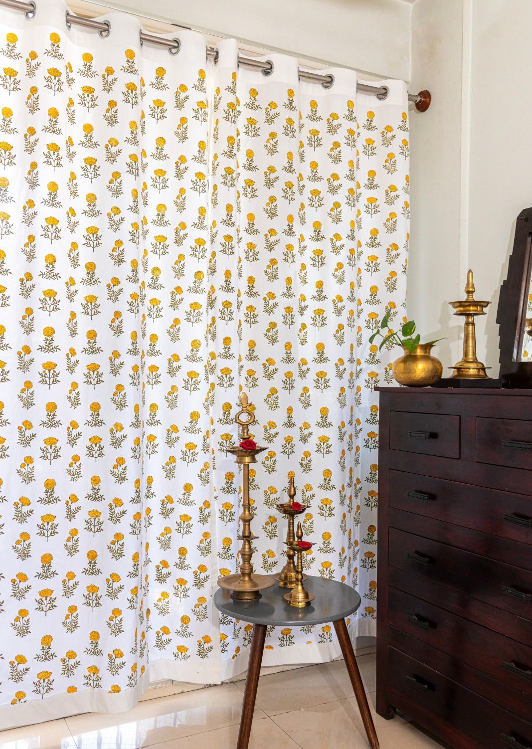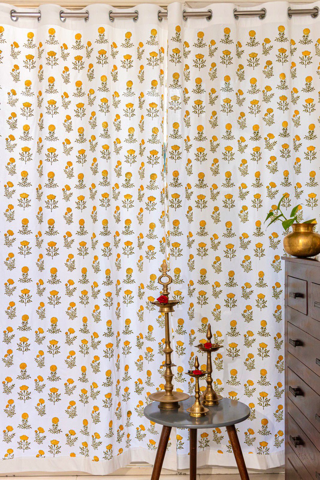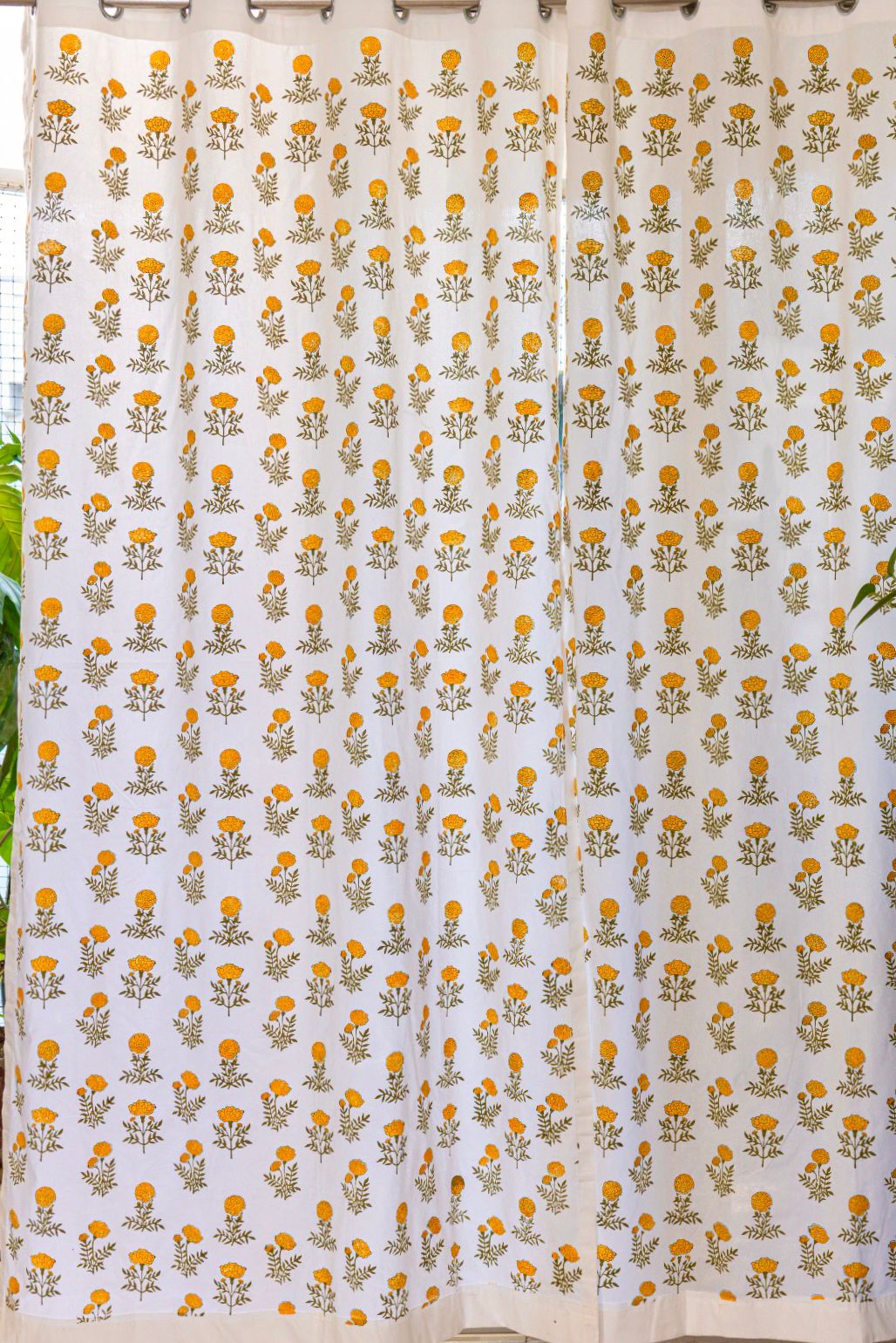 Bring the sunny charm of a garden indoors with our Marigold Curtains. Featuring a vibrant marigold and leaf motif, these hand-block printed panels allow light to filter through, creating a warm and inviting atmosphere in any room.