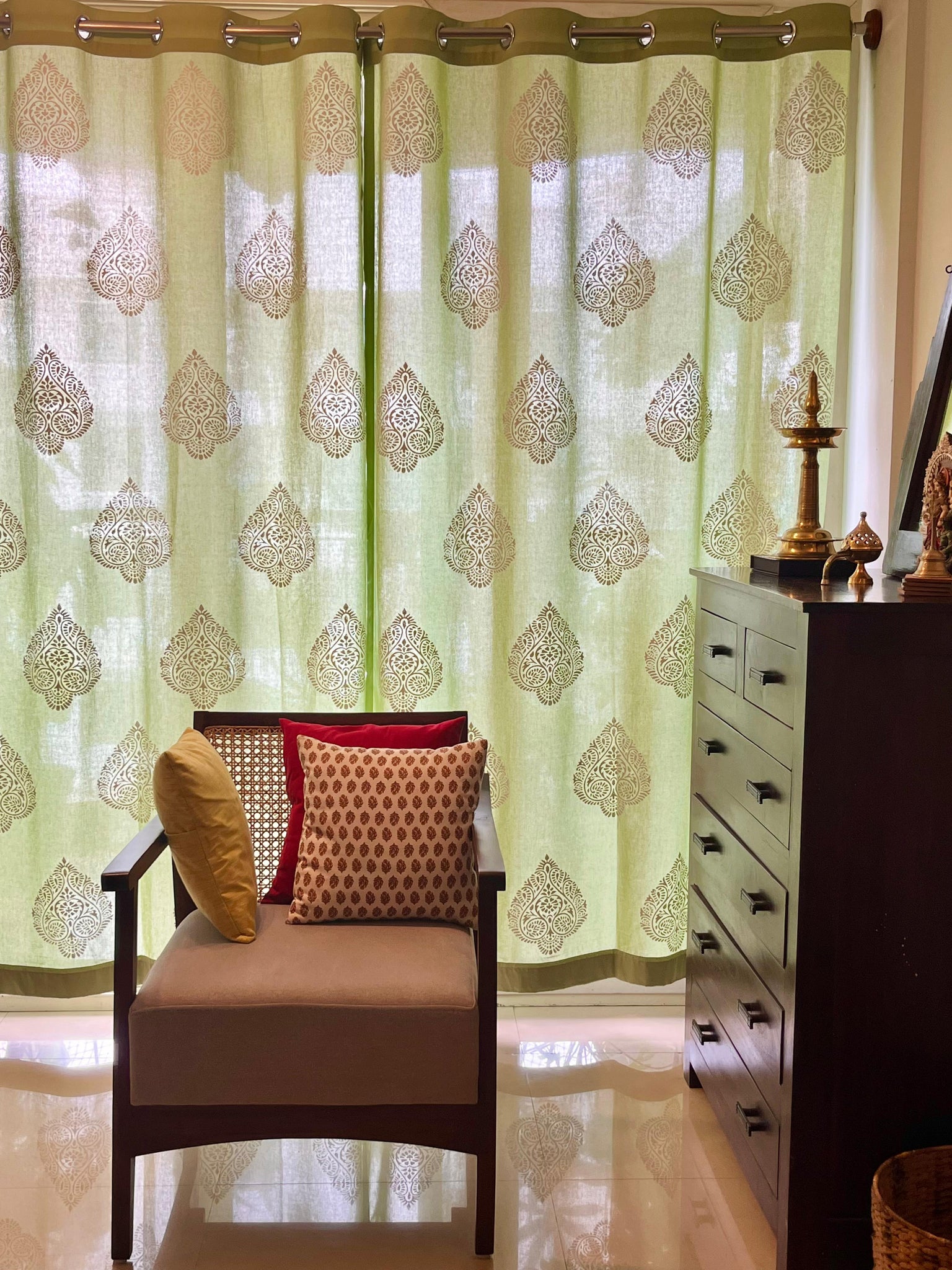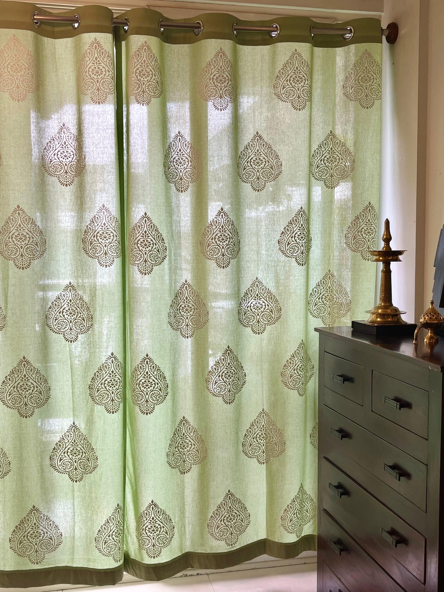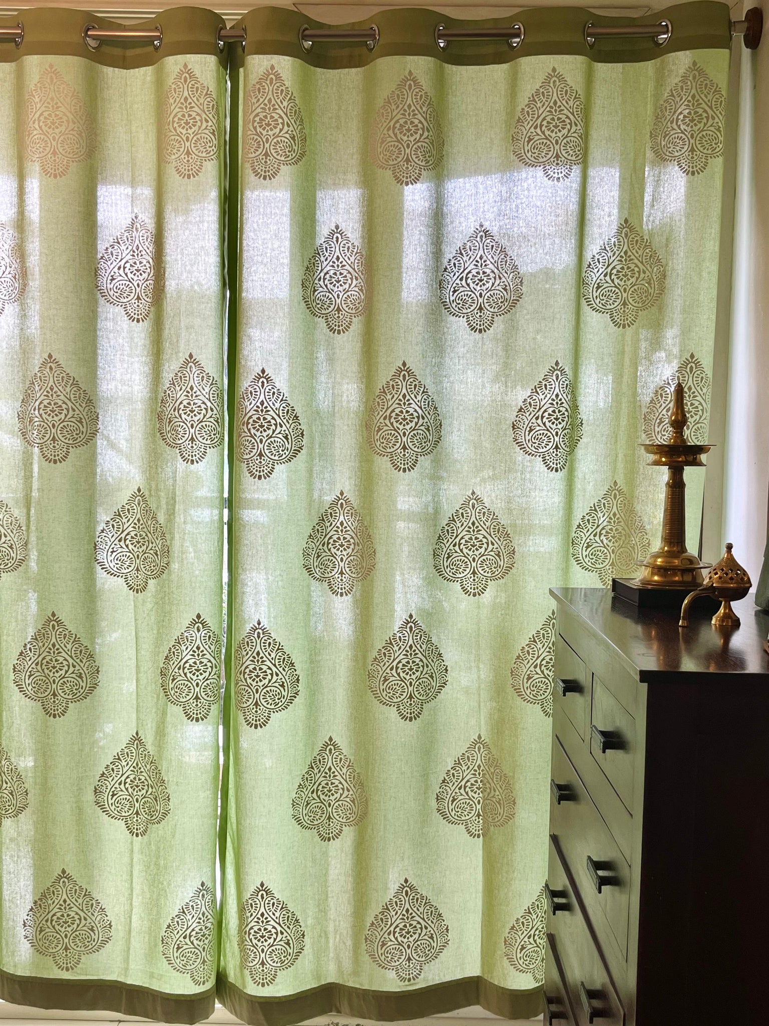 Pure Cotton Solid Pastel Green coloured curtains with White Paan prints. You can pair them with any of our hand block printed white curtains.